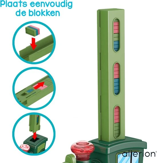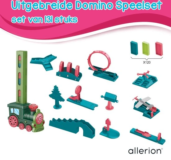 Voor de meest uitdagende domino parcours heb je vele attributen en dominostenen nodig. Deze set bevat maar liefst 120 stenen in verschillende kleuren. Zet de steentjes zelf neer, of gebruik het automatische treintje. Met het lichtgevende knopje kun je deze zelfs sturen! Zo kun je mooie bochten maken, zonder dat je de stenen zelf hoeft neer te zetten. En check ook eens de 11 toffe attributen. Daarmee maak je van elke domino baan een spectaculaire show!