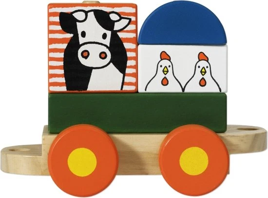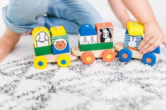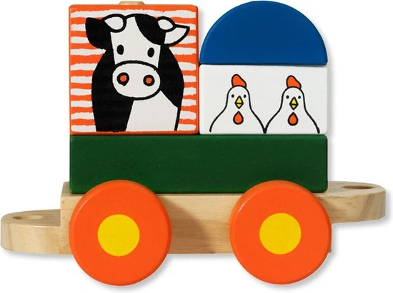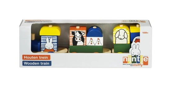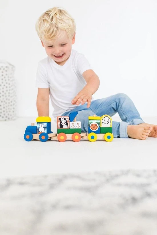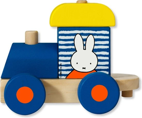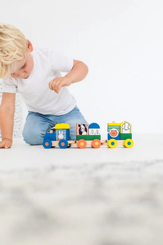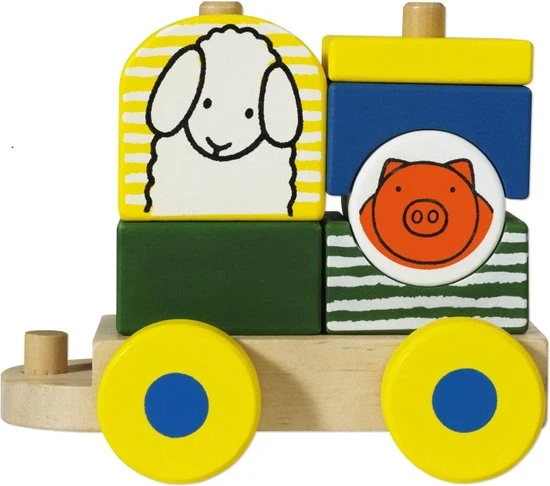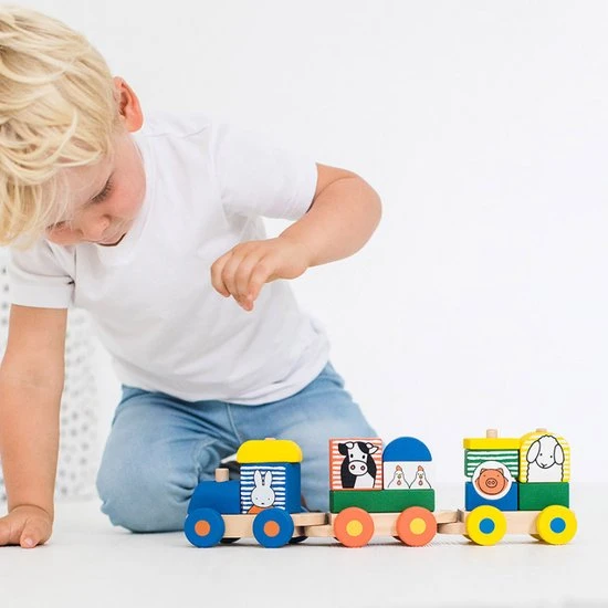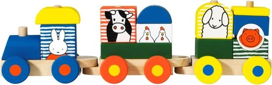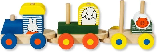 Nijntje rijdt graag in haar treintje en alle dieren mogen natuurlijk mee! Het is een stevige houten trein met gekleurde blokjes die vrij te stapelen zijn op de wagonnetjes. De set bestaat uit 3 wagons en 13 blokjes.