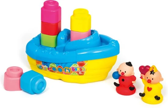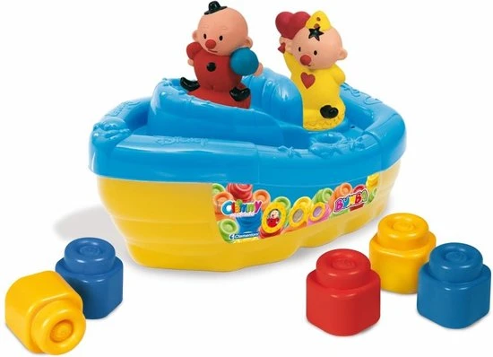 Een bootje gevuld met gekleurde zachte blokken, Bumba en een vriendje.