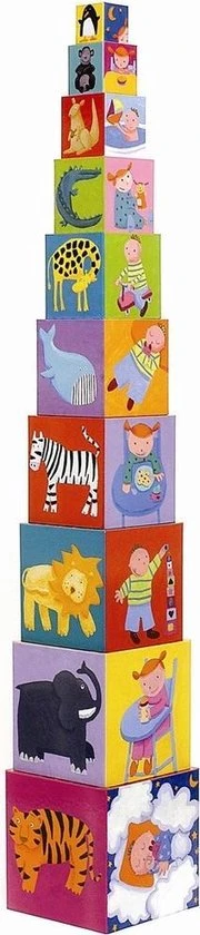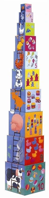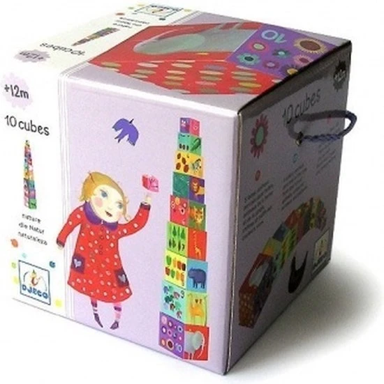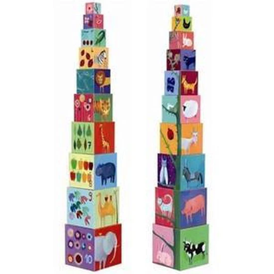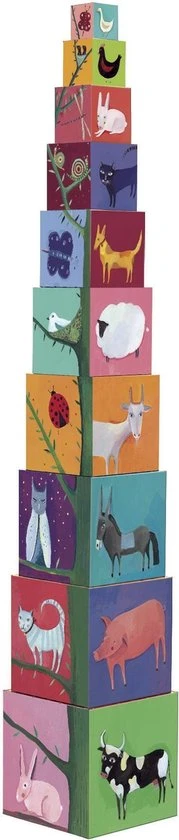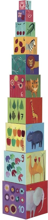 Leuk en kleurrijk stapelspel van Djeco, thema “Natuur en dieren”. Het geheel bestaat uit 10 genummerde blokken en elke kubus is mooi gedecoreerd met kleurrijke tekeningen. Geschikt voor kinderen vanaf 12 maanden