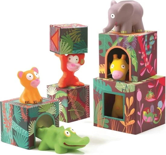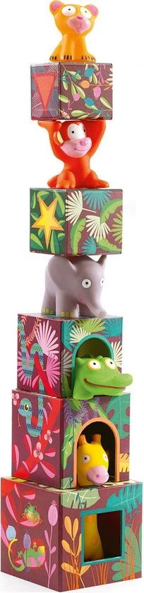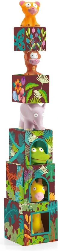 Met deze Djeco stapelblokken Topanijungle en bijgeleverde jungle dieren beleven kinderen super veel plezier! Maak met de stapelblokken een prachtige hoge stapeltoren en bedenk de leukste avonturen voor de jungle dieren. Kinderen kunnen hun fantasie de vrije loop laten met deze leuke stapelblokken. Zo kunnen ze met de blokken knappe dingen bouwen, zoals een hoge stapeltoren of een leuke jungle. Ieder diertje heeft zo zijn eigen huisje en samen vormen deze speelgoed blokken een prachtige blokkentoren bestaande uit mooie stapelblokken. Stuk voor stuk passen deze speelgoed blokken in elkaar net als bij een blokkendoos. Laat jouw kind de leukste avonturen bedenken voor deze grappige jungle dieren.