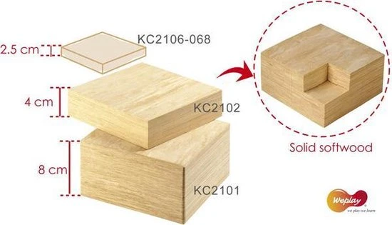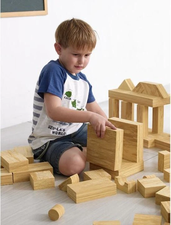 Ziet eruit als hout, maar doet geen pijn Zeer sterk EVA-schuim met een doorlopende houtstructuur voor veilig bouwen, zelfs voor de allerkleinsten. Het spelvolume wordt verminderd door dit lichte, stille en extreem slijtvaste materiaal. 56 bouwstenen in verschillende vormen met een dikte van 8 cm.