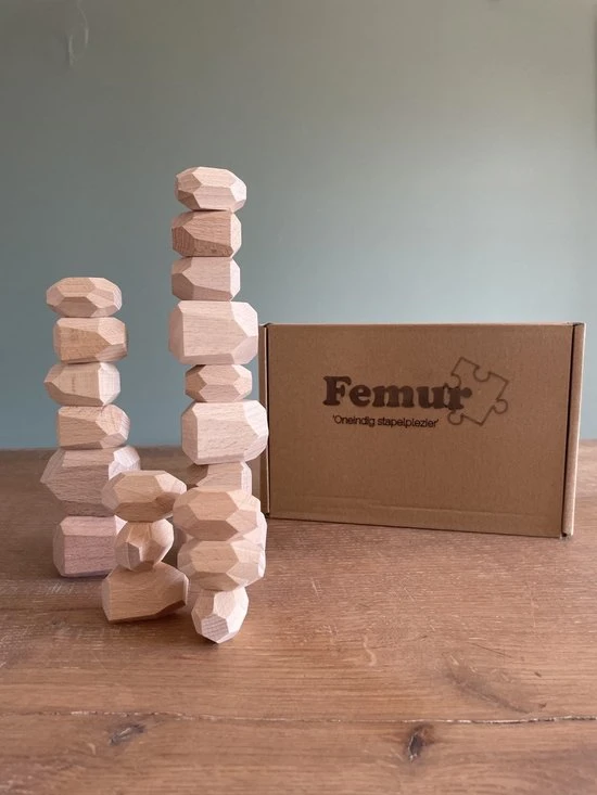 Met de Stapelstenen van Femur is het mogelijk voor uw kindje om alleen te spelen en op een creatieve wijze de meest bijzonder balancerende bouwwerken te creëren. Samen spelen is altijd leuker, dus waarom geen wedstrijd om de hoogste of meest bijzondere toren? U zult uren speelplezier ondervinden met deze unieke set bouwstenen.