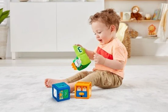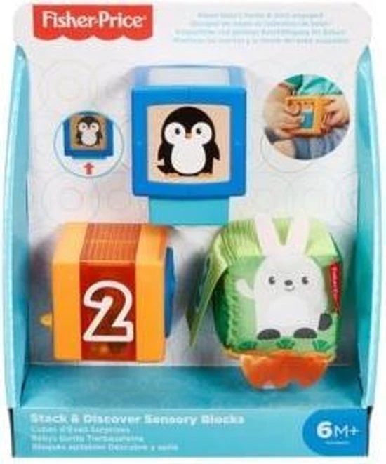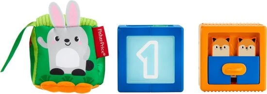 De Fisher-Price stapel & ontdek stapelblokken houden je baby druk bezig met spannend speelplezier dat de sensorische zintuigen stimuleert. De drie blokken van deze set bevatten getallen, vriendelijke dieren, felle kleuren, fijne structuren en verrassende activiteiten voor je baby die naar hartenlust kan draaien, rammelen, pletten, knisperen en glijden! Kleine ontdekkers kunnen urenlang blokken stapelen en hun vaardigheden verbeteren met deze superleuke speelgoedset. Waar ontwikkeling en spel samenkomen Fijnmotorische vaardigheden: Het vastpakken en stapelen van de blokken en het met de handen uitvoeren van activiteiten stimuleert de behendigheid en oog-handcoördinatie van je baby. Ontwikkeling van de zintuigen: De kleuren, rammelgeluiden en structuren prikkelen de visuele en auditieve zintuigen en de tastzin van je baby tijdens het spelen met de blokken. Nieuwsgierigheid en nieuwe ontdekkingen: Je baby maakt kennis met oorzaak en gevolg door te leren hoe de vossen tevoorschijn komen, hoe ze de deur open kunnen maken voor een verrassing en hoe ze met de blokken kunnen schudden voor een rammelend geluid.