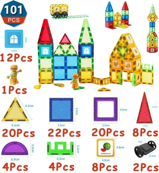 Deze set van 101 stuks bevat uiteenlopende basisvormen in verschillende kleuren en maten. Met deze vormen krijgt je creativiteit een extra boost. De magnetische randen helpen kinderen bij het construeren van bouwwerken. Met het magnetisch speelgoed van Fyse bouwen kinderen de meest fantastische bouwwerken. En deze bedenken ze allemaal zelf. Iedere keer weer wat anders met dit magnetisch speelgoed. Van kastelen tot dieren en van raketten tot cijfers. Dit zorgt voor eindeloos speelplezier. De kleurrijke magnetische bouwblokken prikkelen de creativiteit en fantasie van kinderen. Niets is te gek en dat maakt het zo leuk.