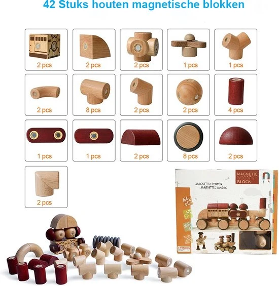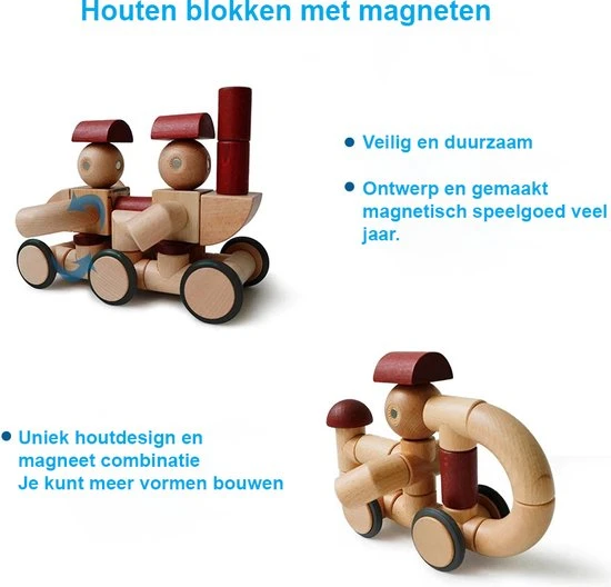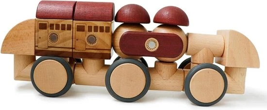 - Houten magnetische blokken – kinderen klikken de blokken door de magneetjes makkelijk aan elkaar.