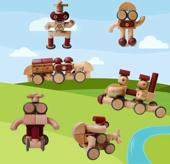 Houten magnetische blokken voor de kleuterschool, fantasiespel en meer! Eenvoudig in elkaar te zetten en eenvoudig in te klappen voor opslag.