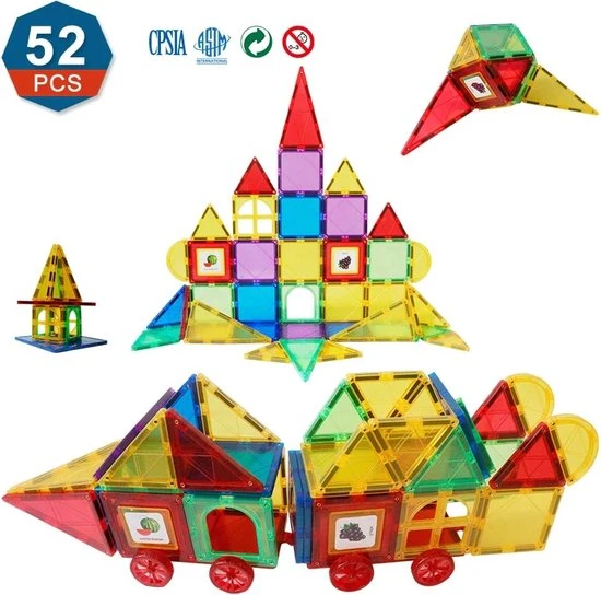 Bevat 52 doorzichtige magnetische tegels. Elke magneettegel kan eenvoudig worden verbonden om 2D- en 3D-vormen te bouwen (zoals huizen, kastelen, vliegtuigen, bloemen). Dit is een geweldige startset voor kinderen. Onze magnetische tegels zijn compatibel met bouwstenen van andere merken en je kunt je bestaande speelgoedset vullen voor onbeperkte creativiteit.