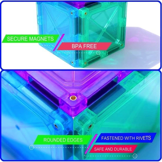 【VEILIGE & DUURZAME EN STERKE MAGNETEN】Het magneetspeelgoed is gemaakt van niet-giftig ABS-kunststof dat veilig en duurzaam is, de grote sterke magneten zijn stevig genoeg om een zware en hoge constructie te ondersteunen zonder in te storten, en de verzegelde klinknagels op de afgeronde randen zorgen ervoor dat de magnetische bouwtegels niet breken . U kunt er zeker van zijn dat uw kinderen alleen spelen met het beste en veiligste peuterspeelgoed op de markt.