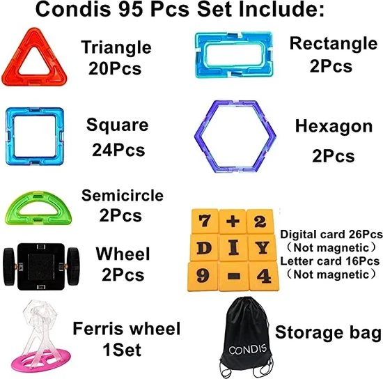 【95 stuks magnetische bouwstenen set】Inclusief 24 x vierkant, 20 x driehoek, 2 x halve cirkel, 2 x zeshoek, 2 x rechthoek, 1 x reuzenrad set, 2 x autowiel, 26 x letterkaart (niet-magnetische kaarten), 16 x digitale kaart (niet- Magnetische kaarten), 1 x opbergtas, 1 x handleiding