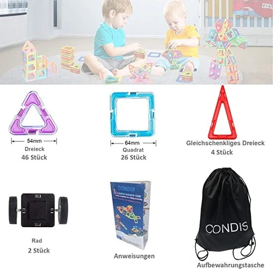 【78 stuks magnetische bouwstenen set】Inclusief 26 x vierkant, 46 x driehoek, 4 x gelijkbenige driehoek, 2 x autowiel, 1 x opbergtas, 1 x handleiding.
