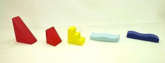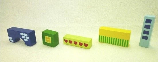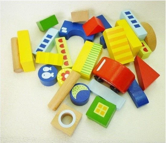 De set bevat 26 blokken in verschillende kleuren, vormen en maten.
