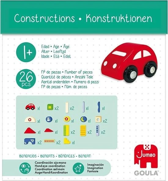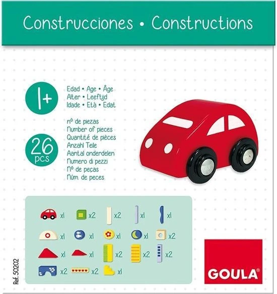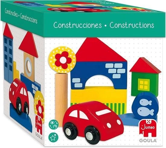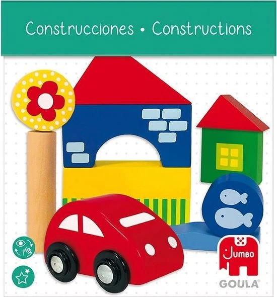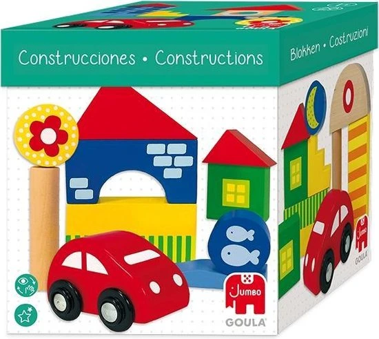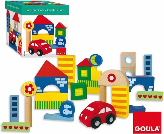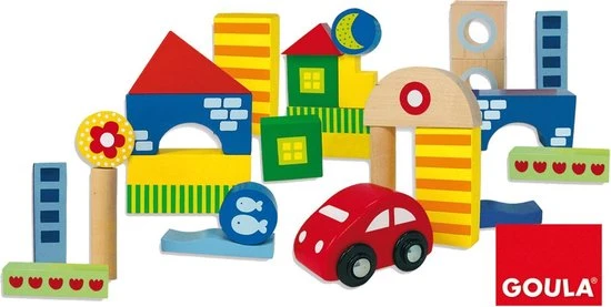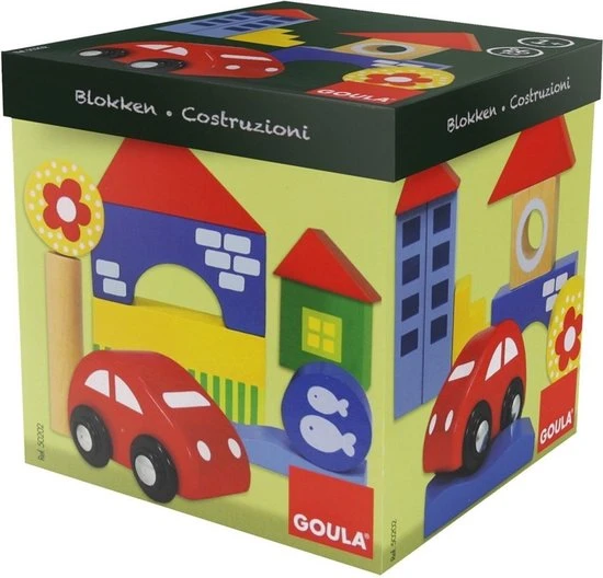Auto’s, huizen, bruggen: alles kun je maken met deze mooie, stevige houten blokken van Goula! In de stevige doos zitten maar liefst 26 blokken in veel verschillende kleuren, vormen en maten. Ook is er een auto met wielen bijgesloten. De handige doos is ook gemakkelijk mee te nemen op vakantie zodat de kinderen ook daar altijd leuk kunnen spelen.