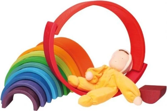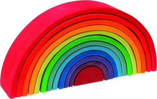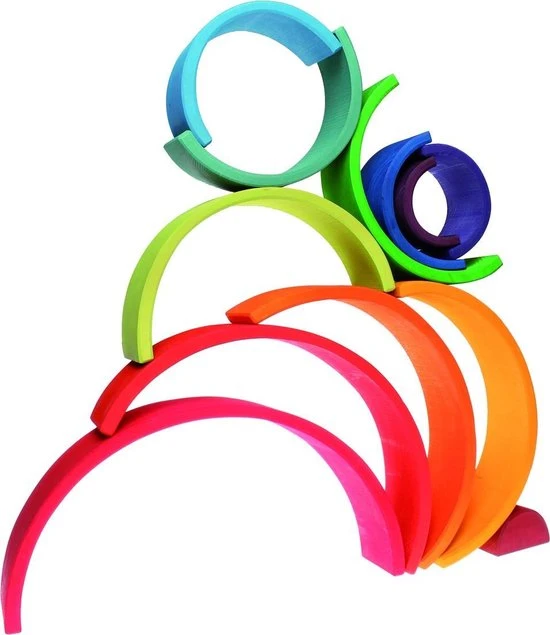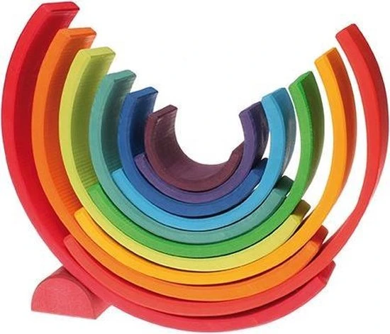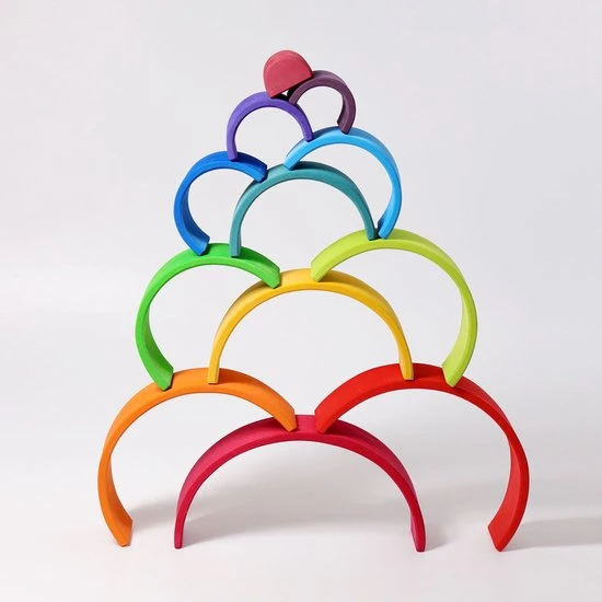 De 12-delige met de handgemaakte grote regenboog van Grimm’s is veel meer dan een mooie regenboog. Als u kinderen ziet spelen met de prachtige bogen, valt meteen op hoe oneindig veel mogelijkheden er zijn. Een moment geleden was het nog een huisje voor kleine houten figuurtjes, een wiegje voor een pop of een brug over water. Het wordt zomaar een hoge toren of een bloem, een flat of een wip. Ze geven kinderen alle ruimte tot eigen vormgeving, fantasie en creativiteit worden gestimuleerd. De diversiteit aan mogelijkheden, de harmonieuze kleuren, het sterke en tijdloze ontwerp, het fijne materiaal welke uitnodigt tot aanraken, maken het tot fantastisch speelgoed, waar ze heel lang en veel plezier van zullen hebben.