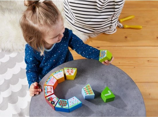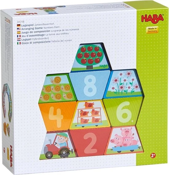 En tellen maar! Bij dit vrolijk gekleurde cijferlegspel met talrijke figuren maken kinderen al spelend kennis met getallen en hoeveelheden. Op elk blokje staat aan de voorkant een tekening uit de boerderij met een bepaald aantal figuurtjes. Op de achterkant vinden de kinderen het bijbehorende cijfer.