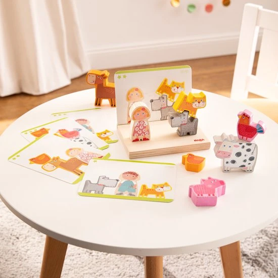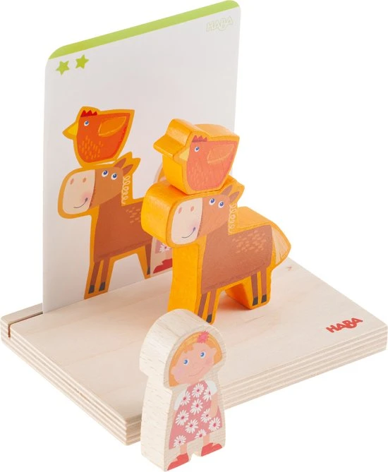 Wat een drukte op de boerderij! De koe en haar vriendjes kunnen telkens weer anders op de basisplaat worden geplaatst en gestapeld. Er kan zowel vrij als volgens de voorbeelden met verschillende moeilijkheidsgraden worden gestapeld. Aan de slag! Inhoud: 8 stapelstenen, 1 stapelbord, 5 aan weerszijden bedrukte voorbeeldkaarten. * leuke uitdaging voor kleine stapelkunstenaars * bevordert de fijne motoriek * om vrij of volgens voorbeelden te stapelen Gewicht product: 0,363 kg Hoogte: 1,5 cm Breedte: 11 cm Lengte: 15 cm Leeftijd vanaf: 2 jaren Aantal onderdelen: 8 stuks Materiaal: Beuk, Karton Artikelnr. 306707