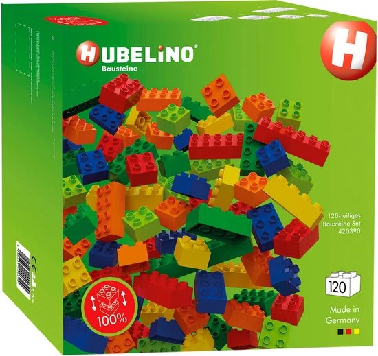De bouwstenenset van Hubelino bevat 120 bouwstenen in verschillende maten en in de kleuren rood, blauw, groen, geel, oranje en lichtgroen. Eindeloos bouwplezier voor kinderen vanaf 1,5 jaar. De bouwstenen worden exclusief in Duitsland vervaardigd en zijn 100% compatibel met populaire bouwstenen van andere fabrikanten.