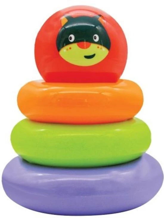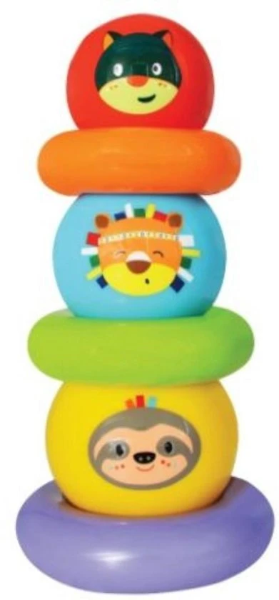 Stapeltoren bestaande uit 6 stukken: 3 ballen en 3 ringen van verschillende maten en kleuren.