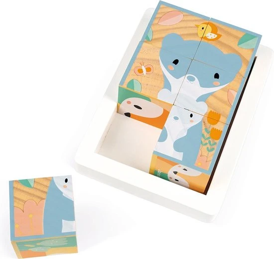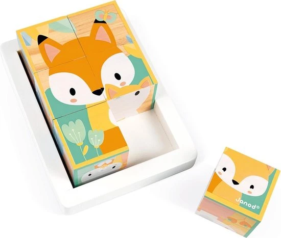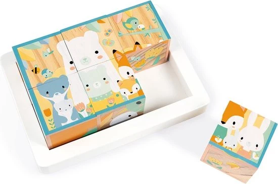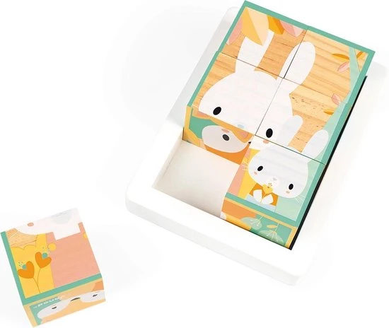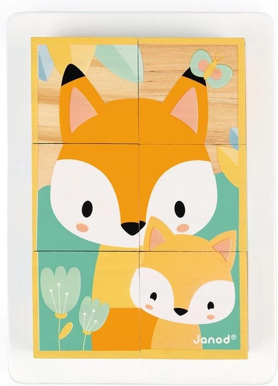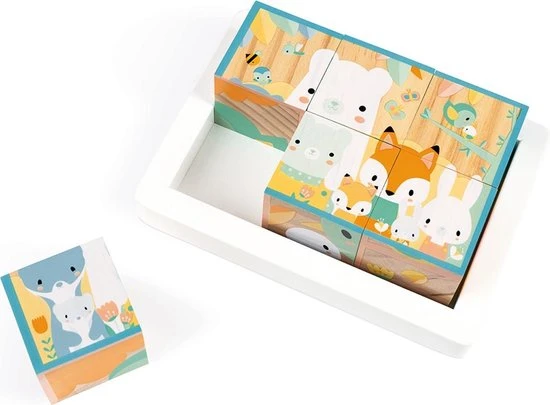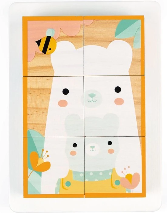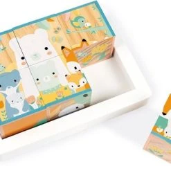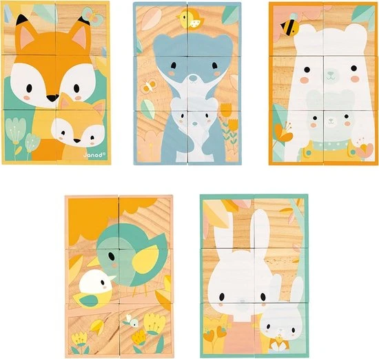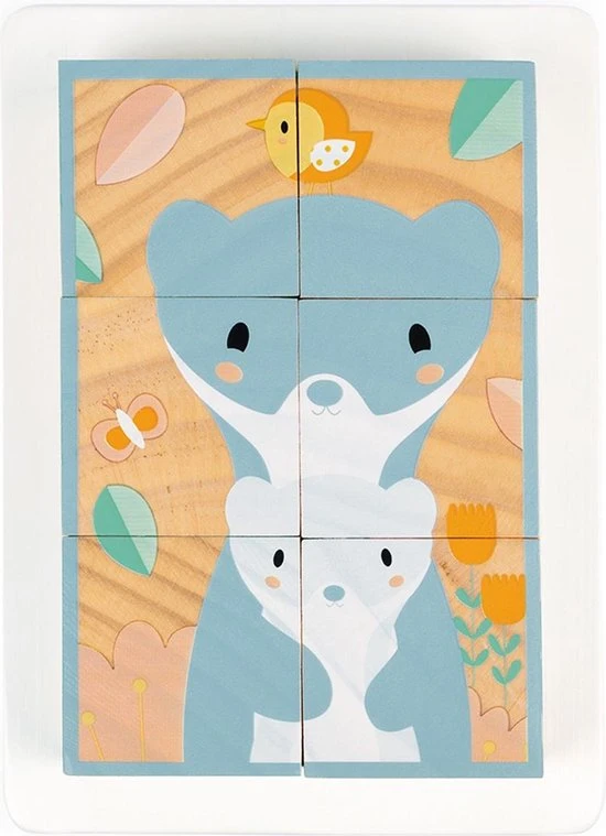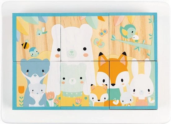 Dit bouwspel bestaat uit 6 blokken van massief hout om uw kind aan te moedigen zijn coördinatie en observatievermogen te ontwikkelen. De 6 afbeeldingen in zachte kleuren, met portretten van dieren met hun kinderen (beer, vos, konijn, wezel, hert),) als thema, bevorderen fantasie en het visueel geheugen bij uw kind.