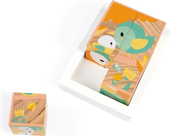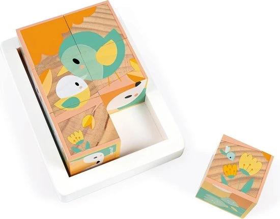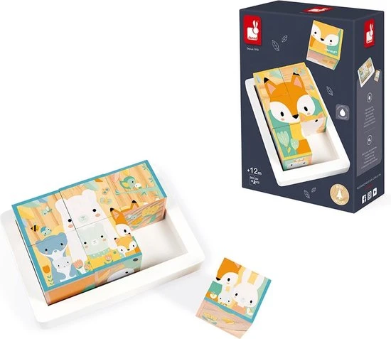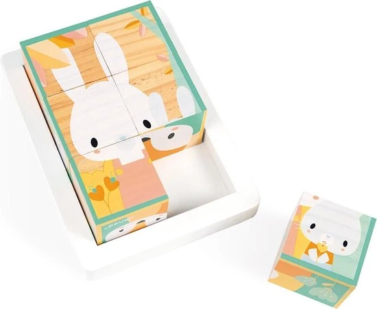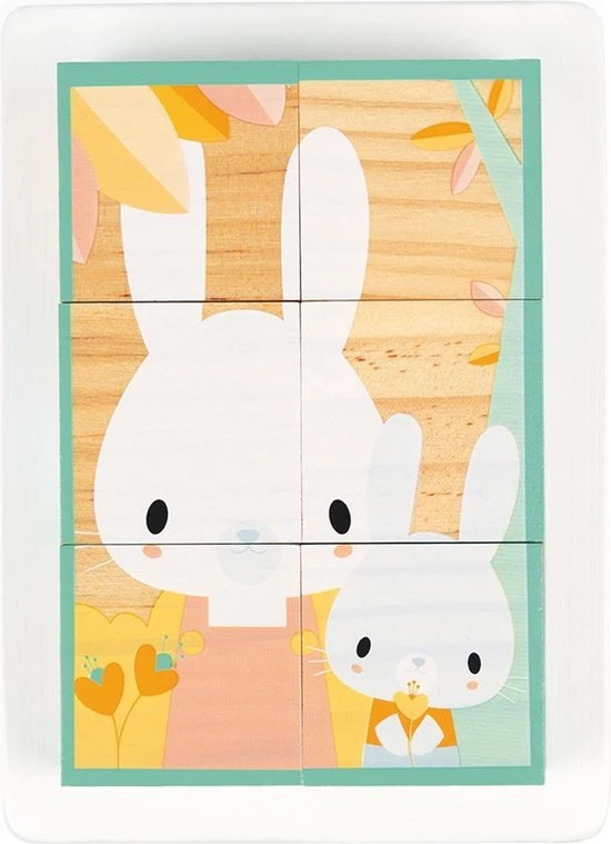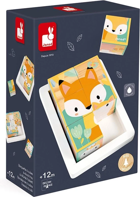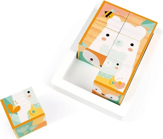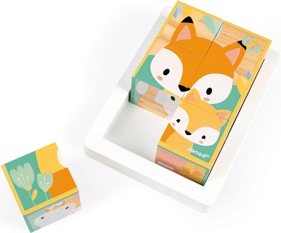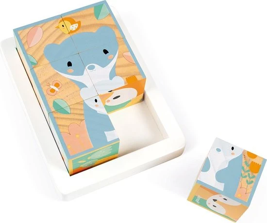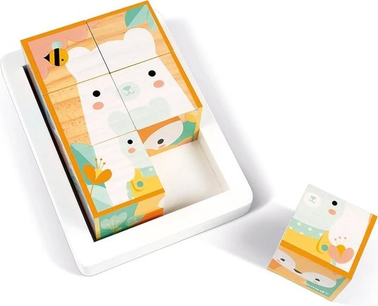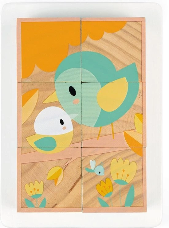 Dit bouwspel bestaat uit 6 blokken van massief hout om uw kind aan te moedigen zijn coördinatie en observatievermogen te ontwikkelen. De 6 afbeeldingen in zachte kleuren, met portretten van dieren met hun kinderen (beer, vos, konijn, wezel, hert),) als thema, bevorderen fantasie en het visueel geheugen bij uw kind.
