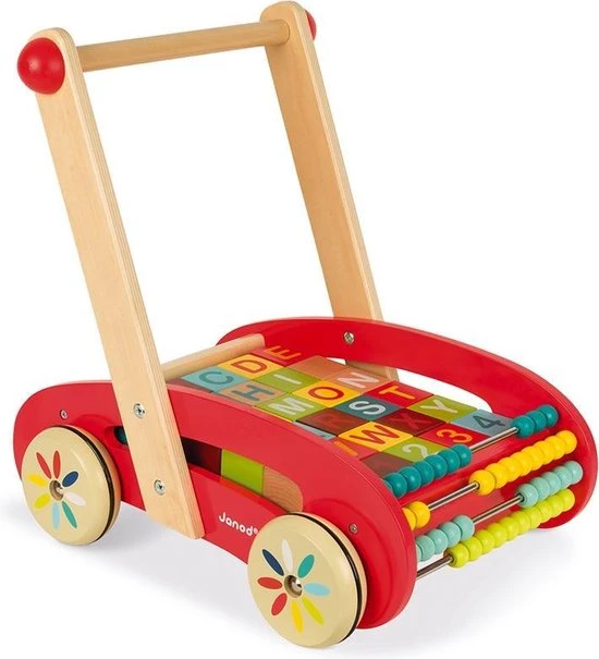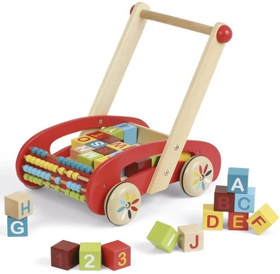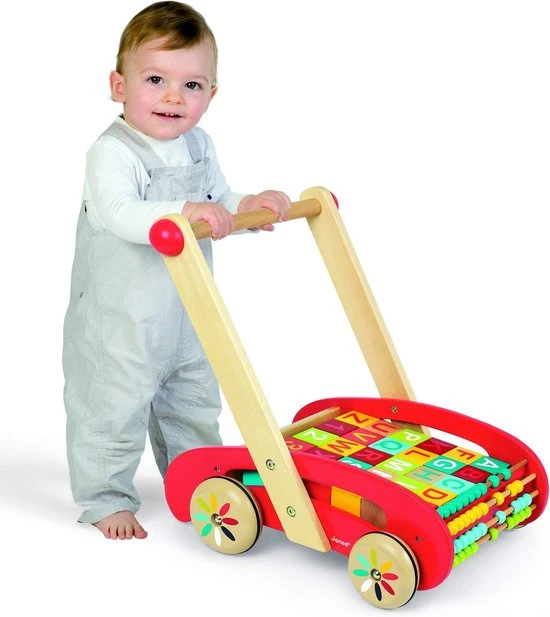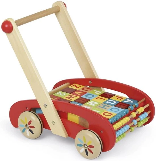 De eerste stapjes met de houten duwkar ABC van de serie Tatoo met 30 cijfers en letters en een telraam. Stevig en handig! Geschikt vanaf 12 maanden.