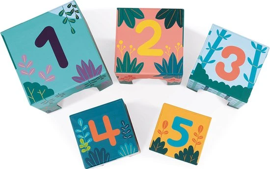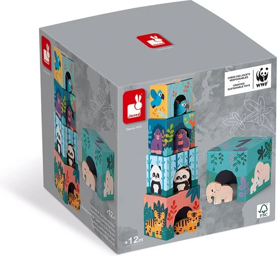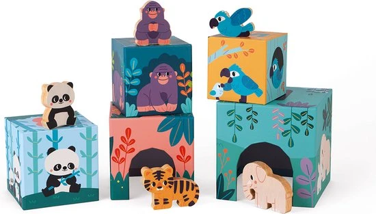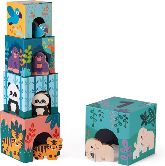 Herken spelenderwijs de verschillende dieren. Bouw een toren met deze kartonnen piramide bestaande uit 5 etages met 5 houten figuren. Elke kubus stelt de leefomgeving van een dier voor waar hij zich achter kan verbergen dankzij de opening aan de voorkant. De dieren zijn van groot naar klein gerangschikt: Olifant, Tijger, Panda, Orang-oetan en Blauwe ara. Op de bovenkant van elke kubs zijn de getallen 1 tot 5 vermeld om het kind meteen ook te leren tellen.