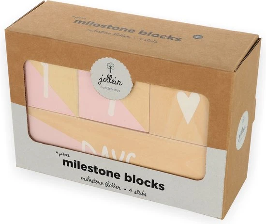 De set bestaat uit 1 groot blok en drie kleinere blokken. Op de kleine blokken staan cijfers en symbolen en op het grote blok staat weken en maanden. Je kunt deze mijlpaalblokken aanvullen met de tweedelige mijlpaalblokkenset uit de Jolleincollectie. Met die set erbij kun je eindeloos veel combinaties maken.