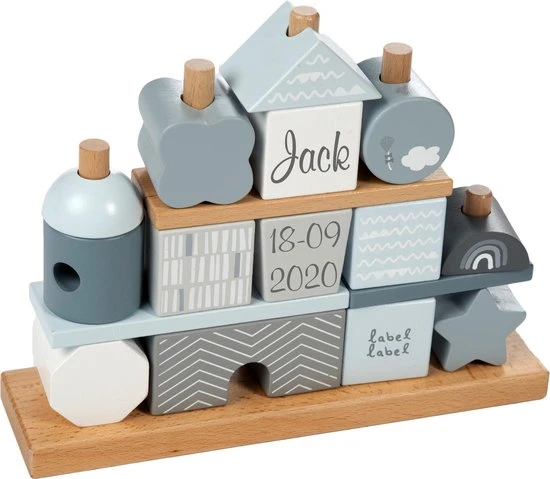 Deze stapelblokjes van Label Label zijn vervaardigd uit kwaliteitsvol FSC gecertificeerd beukenhout en werden voorzien van prachtige blauw/wit/grijze tinten met behulp van kindvriendelijke verf op waterbasis.