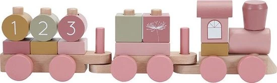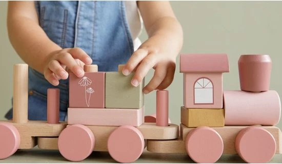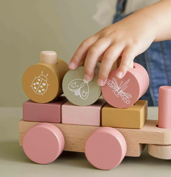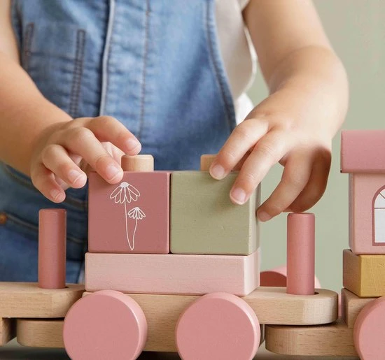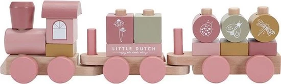 De mooie houten trein van Little Dutch is geïllustreerd met de bloemen en insecten van de Wild Flower collectie. Met de blokken in diverse vormen en frisse, moderne kleuren kun je steeds andere wagons maken. De trein bestaat in totaal uit 17 delen en is ± 45 cm lang.