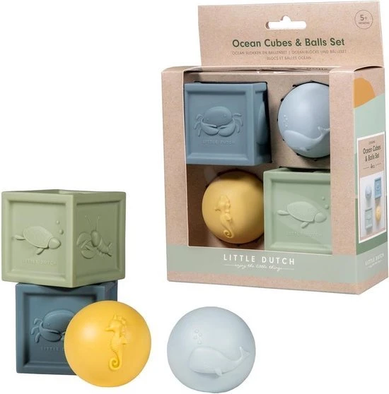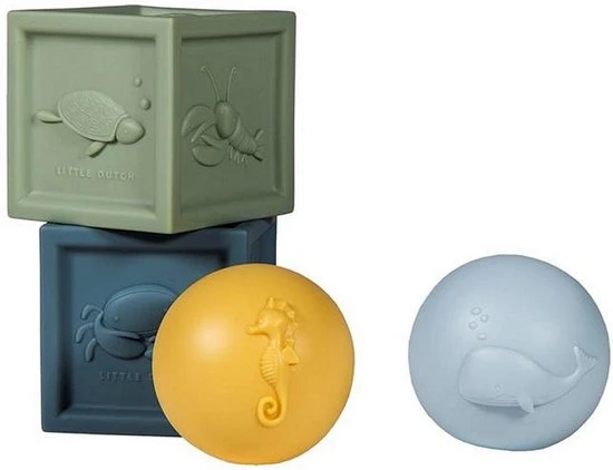 Little Dutch Ocean speelset in zachte kleurstelling, bestaande uit twee ballen en 2 blokken. Gemaakt van PVC. Met behulp van deze blokken en ballen ontwikkelt jouw kindje een fijne motoriek. Het kindje kan leuk spelen met deze ballen en blokken door ze te verplaatsen, stapelen of ermee te rollen. De set is ook leuk om weg te geven als kraamcadeau of voor de eerste verjaardag van een kindje. Iedere bal en blok heeft een eigen structuur waardoor deze anders aanvoelt. Tevens zijn ze voor kinderhanden gemaakt en gemakkelijk vast te pakken. Geschikt voor kinderen vanaf 5 maanden.