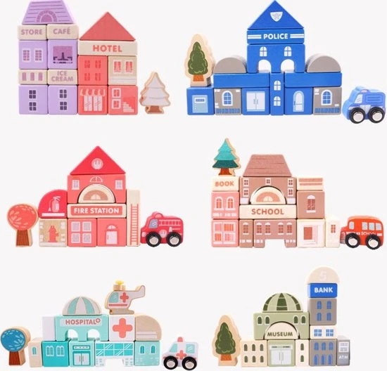 Puzzel je plattegrond in elkaar en bouw daarop je heuse stad met blokken, auto’s, bomen, gebouwen zoals een school, ziekenhuis, politiekantoor enzovoort. Het bouwen van eindeloos veel verschillende creaties bevordert niet alleen de creativiteit, maar is ook goed voor hand- oog coördinatie, motoriek, sociale- en spreekvaardigheden. Zo zal jouw kleintje niet alleen uren speelplezier bevelen, maar ook al spelenderwijs leren. In het pakket kan je o.a een grondpuzzel, auto’s, bomen en blokken terugvinden.