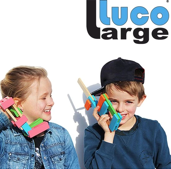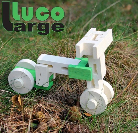 Deze bouwstenen passen goed in elkaar en voelen fijn aan. Geen plastic, maar eco vriendelijke stenen. Het is eigenlijk een combi van Kapla plankjes en Lego. Maar dan 100% natuurlijk en uniek. Luco stimuleert de fantasie en creativiteit van kinderen omdat het niet voorgevormd is en omdat de blokken op heel veel verschillende manieren gebruikt kunnen worden. Niet 2d of 3D, maar 4D. Luco heeft een mooi design, een echte plus. Luco Large stenen liggen lekker in de hand. Kinderen kunnen het zo gek niet bedenken, maar alles is mogelijk. Van deze coole auto, een fantasiedier, een vliegtuig, trein, boom, mens, robot of tennis racket. Alles is mogelijk en kan! Have fun!