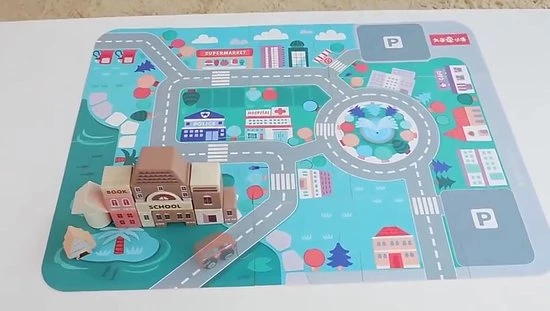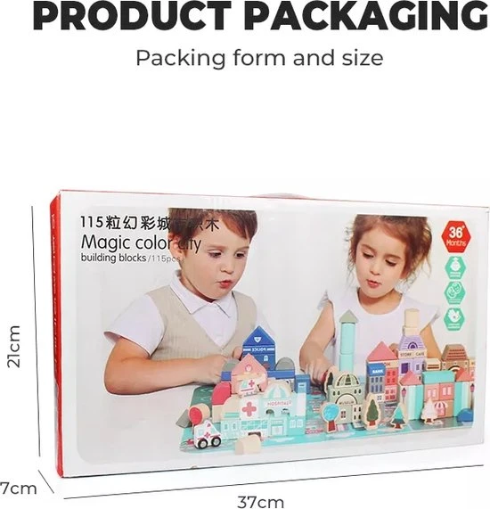 Deze set bevat 115 gekleurde blokken die een kleurrijke stad vormen, geleverd in een handig koffertje.