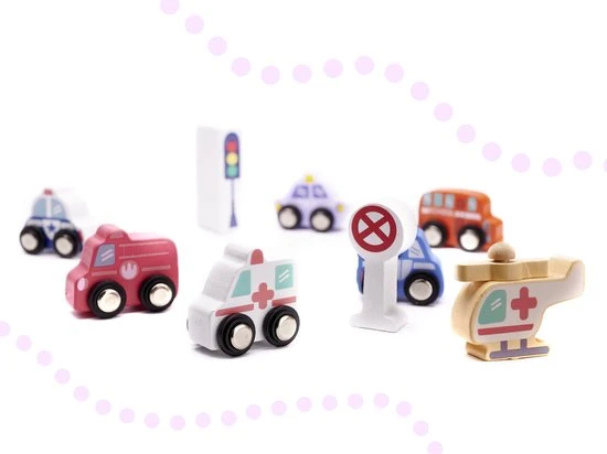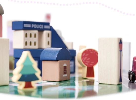 De stad mag de belangrijkste straten en auto’s niet missen . De set bevat een puzzel met een strook straten die het geheel compleet maakt. Een set veelkleurige blokken is een voorstel voor creatief, ontwikkelingsplezier.