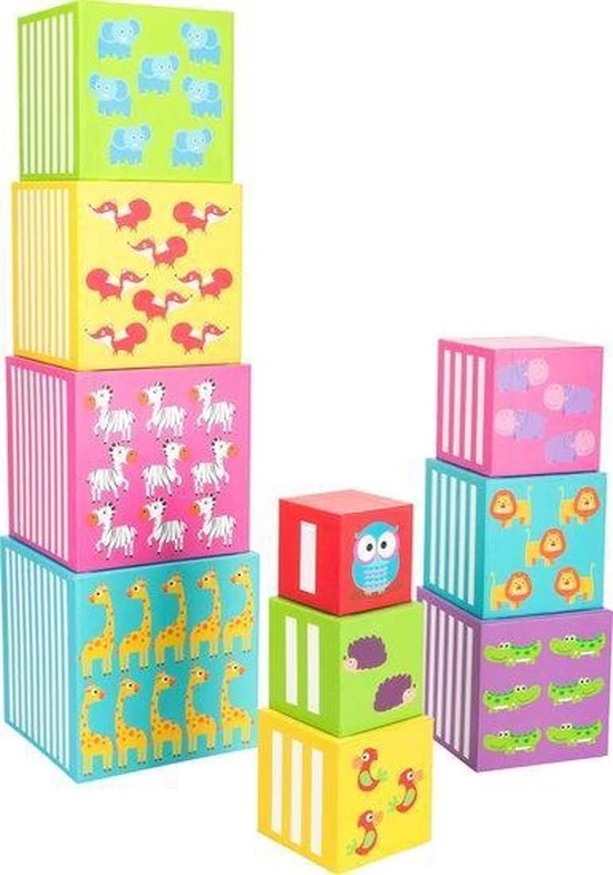 De blokken worden hier hoog opgestapeld! Deze vrolijke wilde dieren nodigen jonge bouwmeesters uit om hun stapelvaardigheden te bewijzen. De 10 stapelkubussen gemaakt van stabiel, lichtgewicht karton zijn bedrukt met grappige dieren en cijfers die kinderen op een speelse manier over cijfers leren. Bij het stapelen trainen kinderen ook hun fijne motoriek en concentratie. Alle kubussen kunnen gemakkelijk in elkaar worden gestapeld om ruimte te besparen.