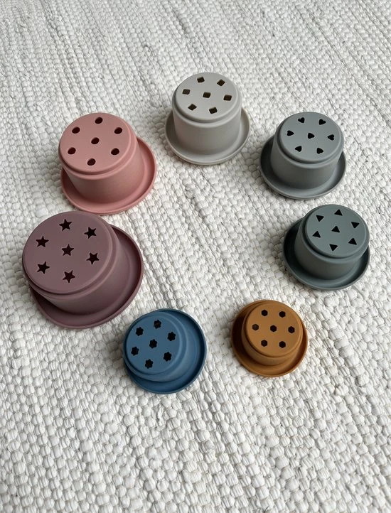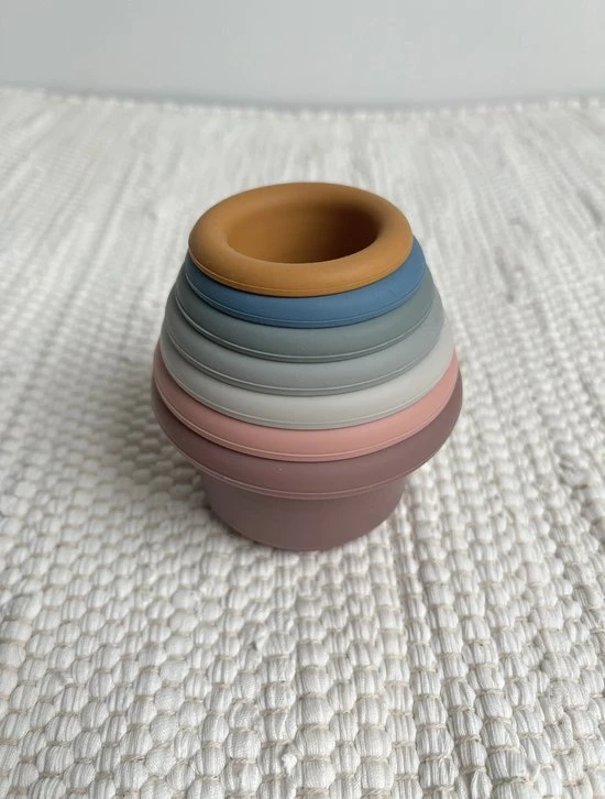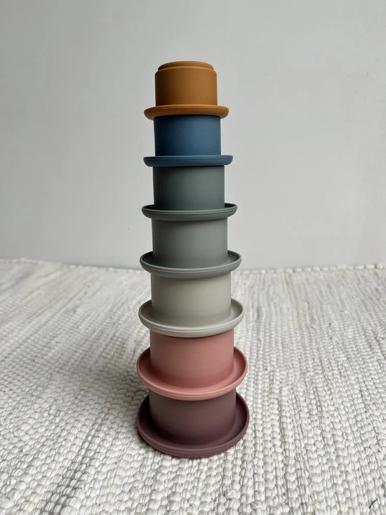 Deze silicone stapeltoren heeft 7 gekleurde bekers met op elke beker een ander vormpje. Naast het leuke design is het ook nog eens erg goed voor de motorische ontwikkeling en oog-handcoördinatie van je kleintje. Het leuke is dat ermee gestapeld kan worden. Maar het kan ook als vormpje voor in het zand gebruikt worden of zelfs mee in bad worden genomen.