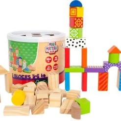 Maak elke dag een nieuw indrukwekkend bouwwerk met deze kleurrijke houten blokken van Mini Matters, in praktische emmer met gestanste deksel.