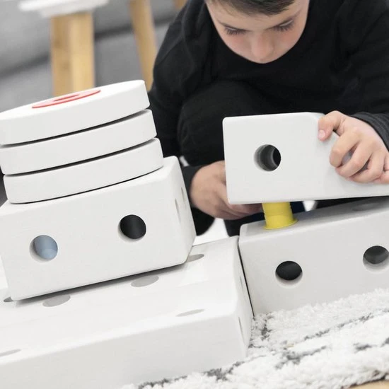 Onze Modu blokken bestaan uit 100% niet-giftig, sterk en zacht EVA-schuim. Hetzelfde materiaal als in yogablokken of slaapmatjes. Het materiaal heeft verschillende goede eigenschappen zoals het is geluidsabsorberend, antislip, gemakkelijk schoon te maken en veilig voor uw kinderen en uw vloer! Dit betekent ook dat vlekken een natuurlijk onderdeel zijn van de levensduur van het duurzaam materiaal. Na verloop van tijd zijn vlekken te verwachten. Ze hebben geen invloed op de functionaliteit van het open ended speelgoed en kunnen worden verminderd door kokend water over de zachte blokken te gieten.