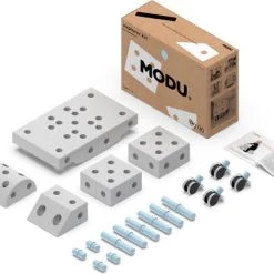 Alle types bouwpakketten ( Curiosity Kit, Explorer Kit, Dreamer Kit en Half Bal kit) is een samengesteld pakket van zachte blokken, staven en wieltjes die geschikt zijn voor jongens en meisjes van 0 – 6 jaar. MODU is ontworpen om veel mogelijkheden te bieden met slechts een paar zachte blokken. Modu is open ended speelgoed, actief speelgoed voor baby’s of voor kinderen van de leeftijd van 1 jaar.