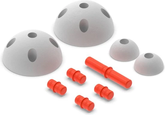 In de MODU Half Balls kit vind je 2 kleine halve ballen, 2 grote halve ballen, 4 korte staven en 1 lange staaf,