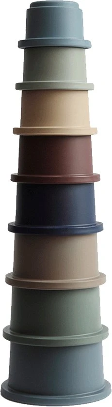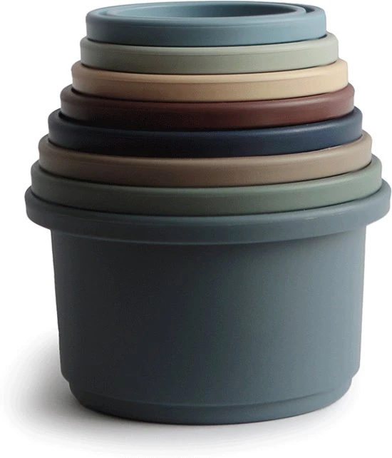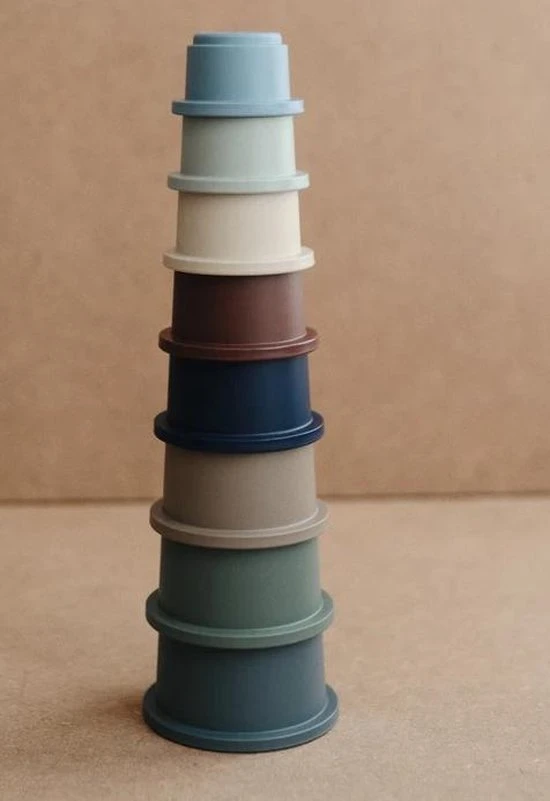 Het stapelen van de bekertjes stimuleert de ontwikkeling van de motorische vaardigheden.
