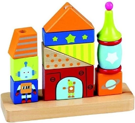 Een houten stapelspel met blokken in ruimte robot thema. Leuk motoriek spel voor peuters en kleuters waarin de fijne motoriek uitgedaagd wordt. Weet jij welke blokken waar gestapeld moeten worden. Spelenderwijs bouwen en creeëren, ga jij de uitdaging aan?!