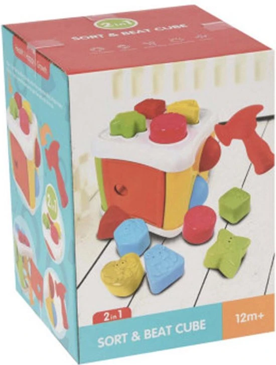 De 2-in-1 Sort & Beat Cube van Sort & Beat is leuk om mee te spelen en stimuleert de motoriek van je kindje. Het combineert de ontwikkeling van de herkenning van de vormen en het plezier van het timmeren op de ballen aan de zijkant. De kubus bevat o.a. een vormenstoof waarbij verschillende vormpjes in de juiste plek gestopt moeten worden. Daarnaast kan jouw kindje timmeren op de ballen aan de zijkant met het bijbehorende hamertje. Ook is de kubus aan de zijkant te openen. Geschikt vanaf 12 maanden.