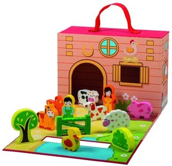 Een handig kartonnen koffertje dat met een magneet gesloten gehouden wordt. Maar als het opengaat, lopen de dieren er zo uit en is het koffertje een boerderij geworden, compleet met hekjes en vijver!