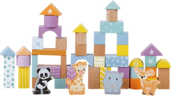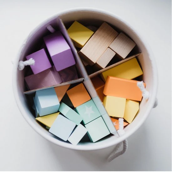 Een blokkenton bestaande uit 50 blokjes om mee te spelen. Na het spelen kunnen de blokjes weer netjes opgeborgen worden in de kartonnen ton met deksel en handvat.