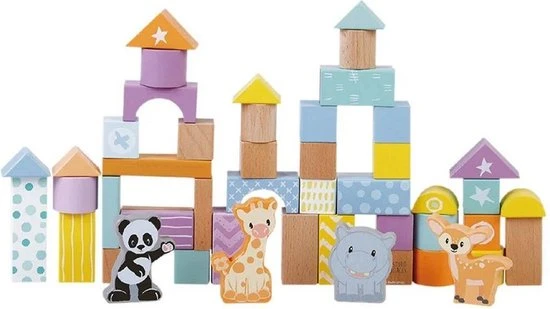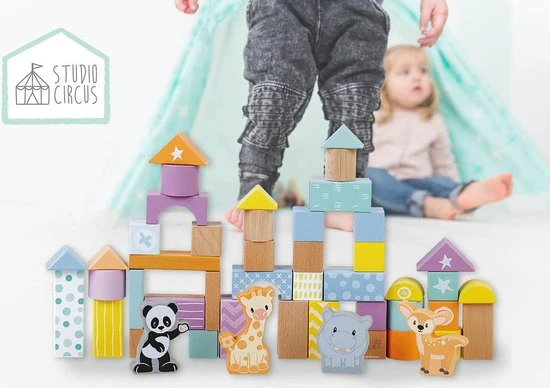 Met 50 houten blokjes in vrolijke kleuren is alles mogelijk. Creëer zelf de wereld van Studio Circus samen met de houten figuren van de panda, giraffe, het nijlpaard en hertje. Na het spelen kunnen de blokjes weer netjes in de stevige, kartonnen ton met deksel en handvat. Bevordert het gebruik van de fantasie en spelenderwijs worden de fijne motoriek en oog-handcoördinatie ook getraind.