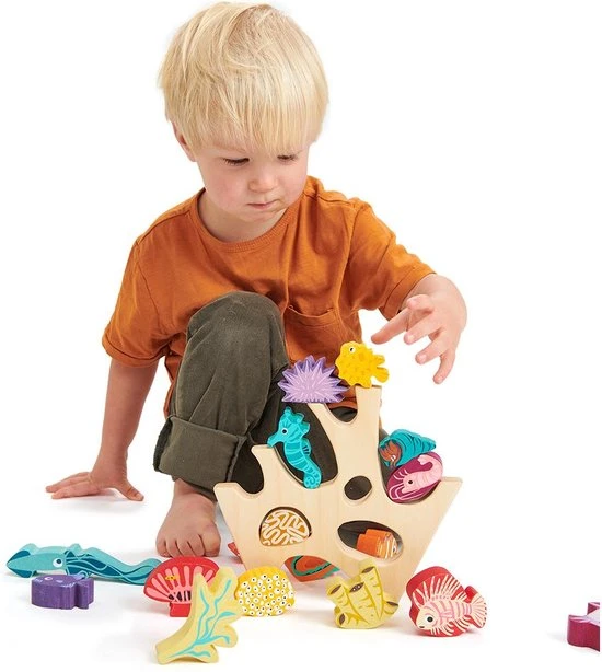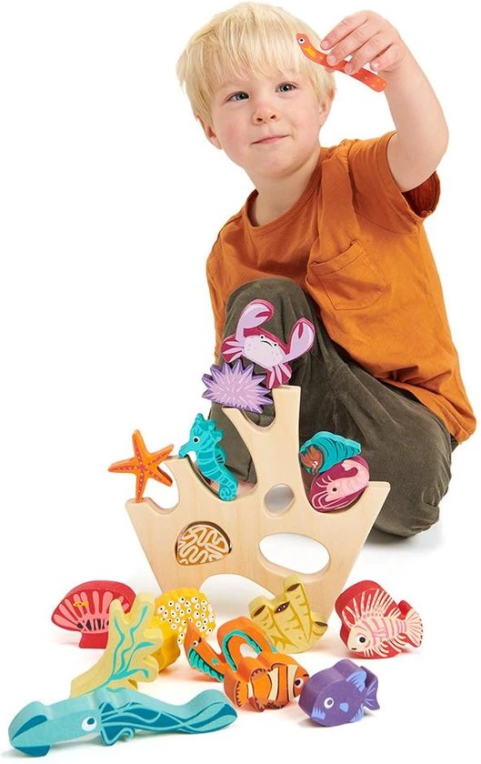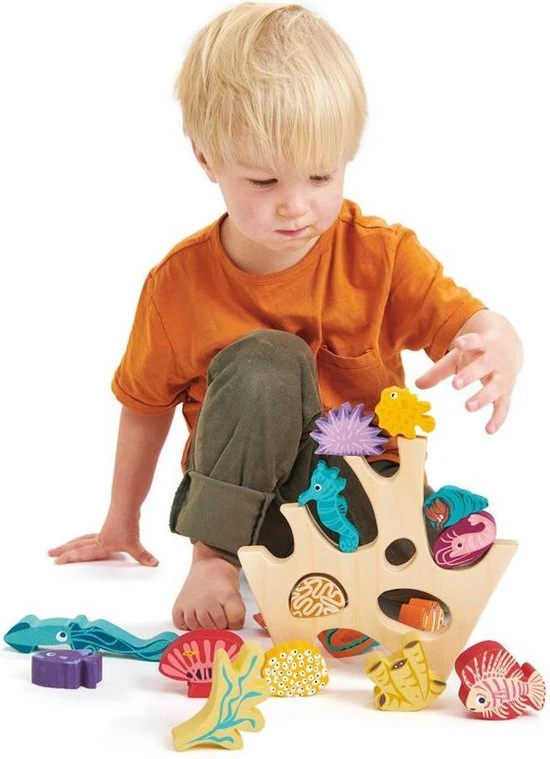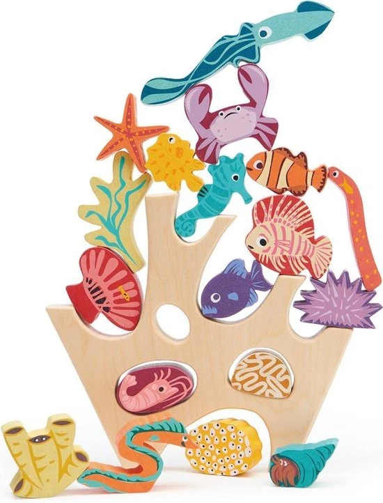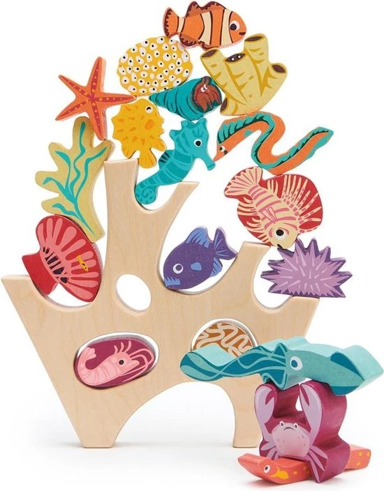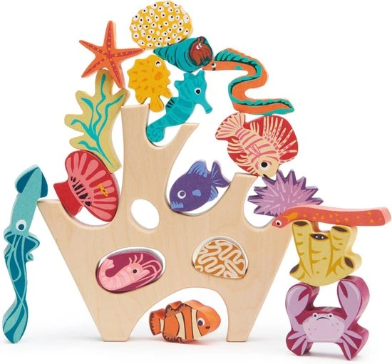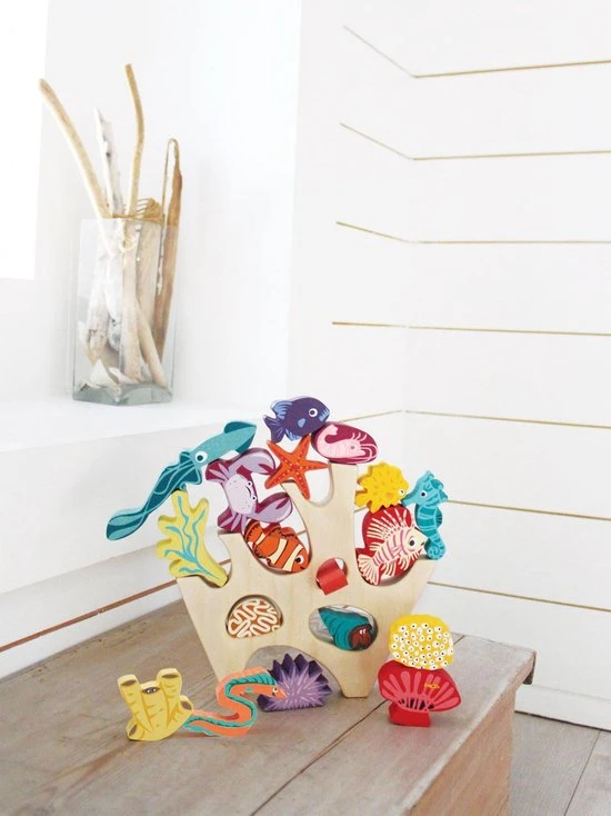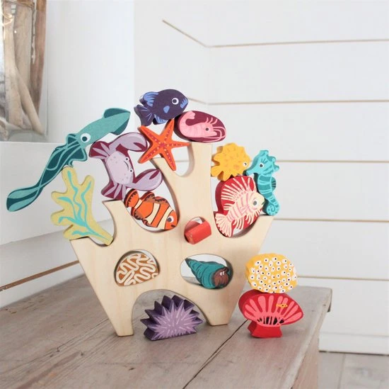 Beleef een hoop plezier met deze houten Koraalrif-stapelset! Stapel de verschillende zeedieren op de zee rots zonder dat hij omvalt.