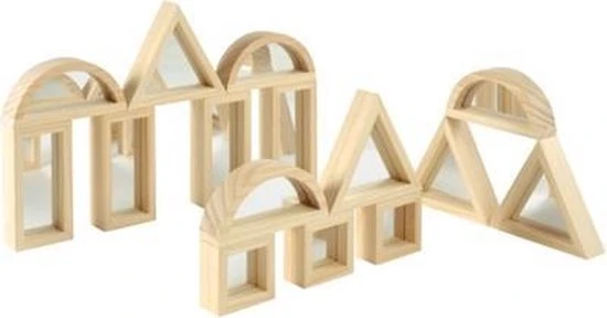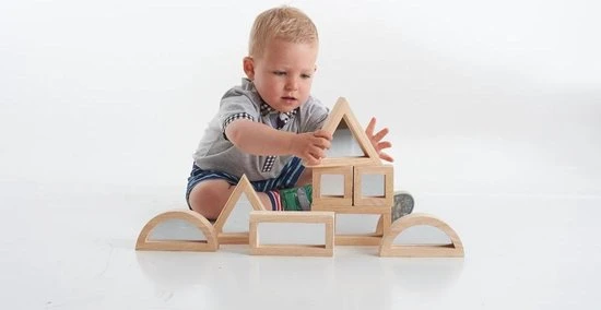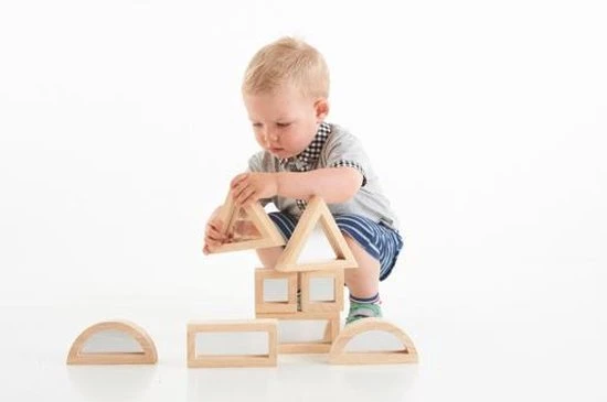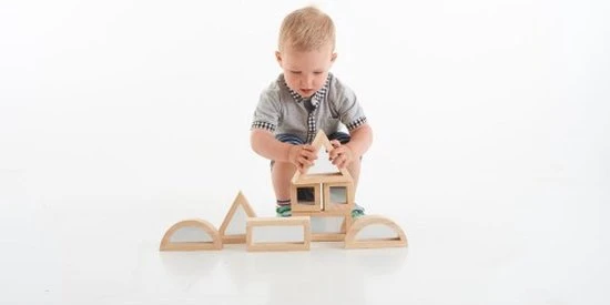 Deze bijzondere blokken van TickiT zijn aan beide zijden voorzien van spiegels (acryl dus niet breekbaar). Dit voegt een extra element toe aan het bouwen! Zie hoe de omgeving wordt weerspiegeld in de blokken. De blokken zijn lekker groot en stevig en ook leuk voor de allerkleinsten om zichzelf in te ontdekken. De blokkenset bestaat uit 2 vierkante blokken, 2 halfronde blokken, 2 rechthoekige blokken en 2 driehoekige blokken.