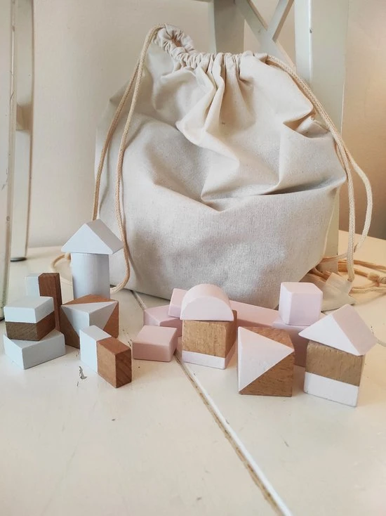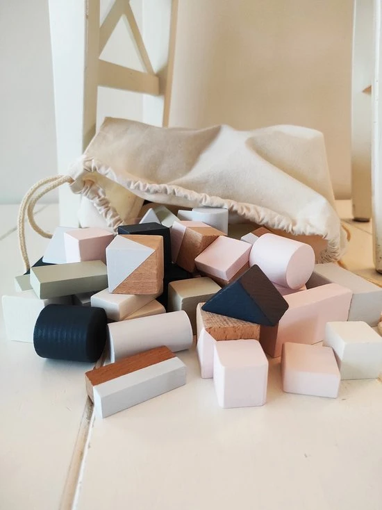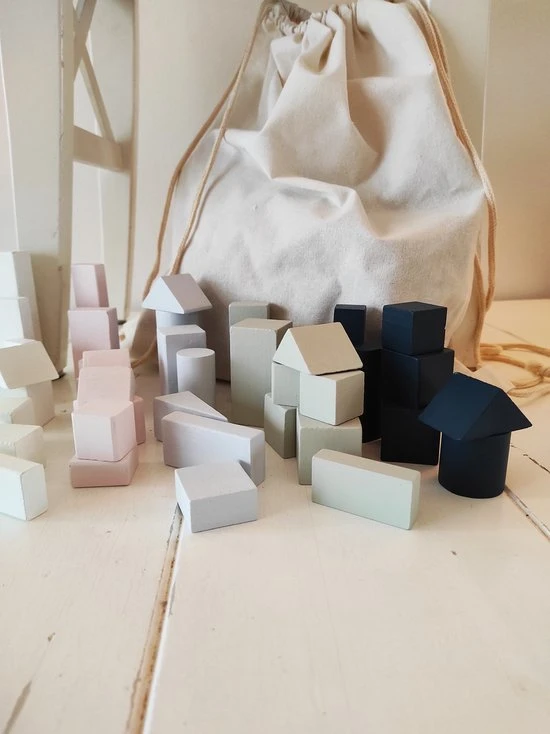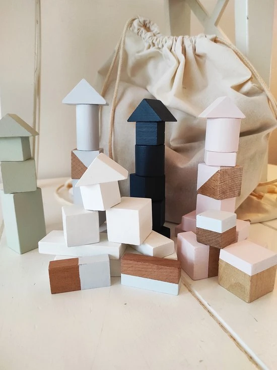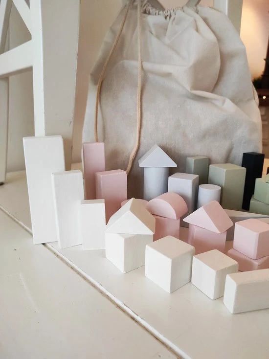 46 stuks unieke houten blokken die met de hand zijn geschilderd met een kindvriendelijke zeer matte verf in vrolijke pasteltinten.