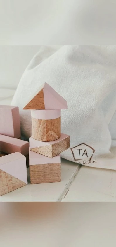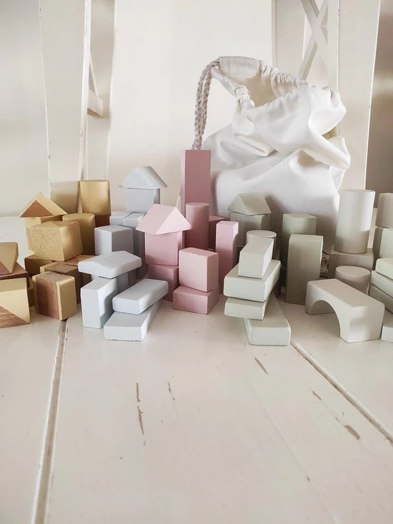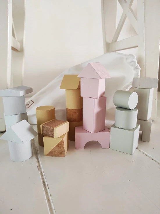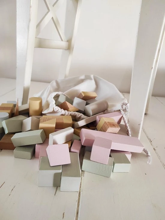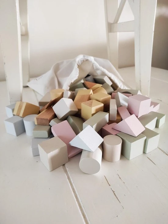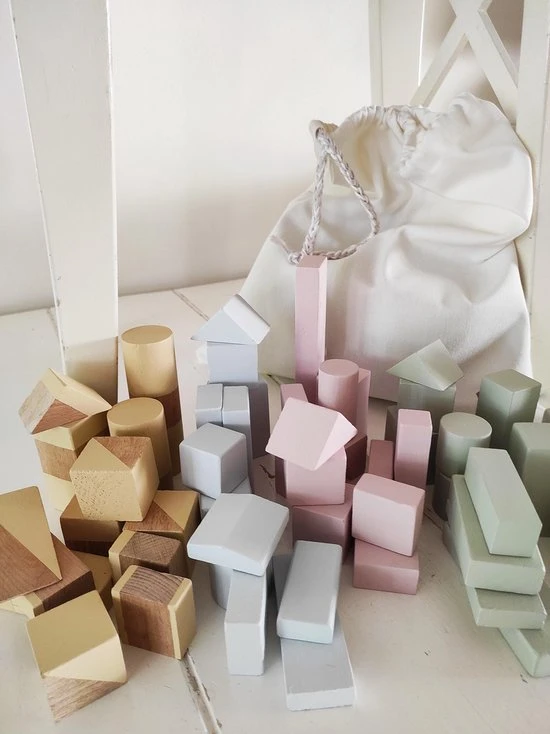 Deze 62-delige blokkenset is met de hand geschilderd met een kindvriendelijke zeer matte verf in vrolijke pasteltinten.